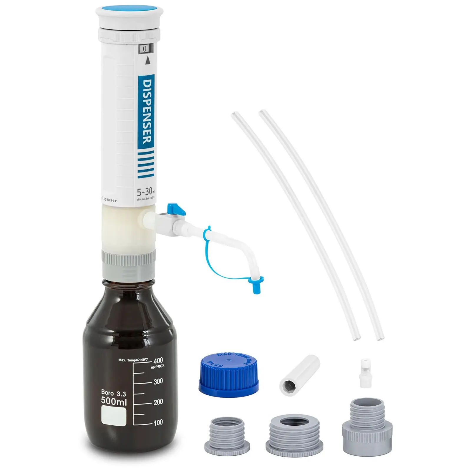 Přesný dávkovač do lahví z laboratorních potřeb společnosti Steinberg Systems umožňuje bezpečné a přesné dávkování kapalných chemikálií, např. slabých kyselin nebo zásad. Digitální ukazatel objemu umožňuje nastavte požadované množství mezi 5 - 30 x 0,5 ml a dávkovač pro lahve bezpečně a spolehlivě vydá odpovídající objem stisknutím tlačítka. Díky vysoké teplotní a odolnosti vůči kyselinám a větracímu otvoru je dávkovač na láhve vhodný pro širokou škálu aplikací. Pro splnění příslušných norem je tento model také plně autoklávovatelný.