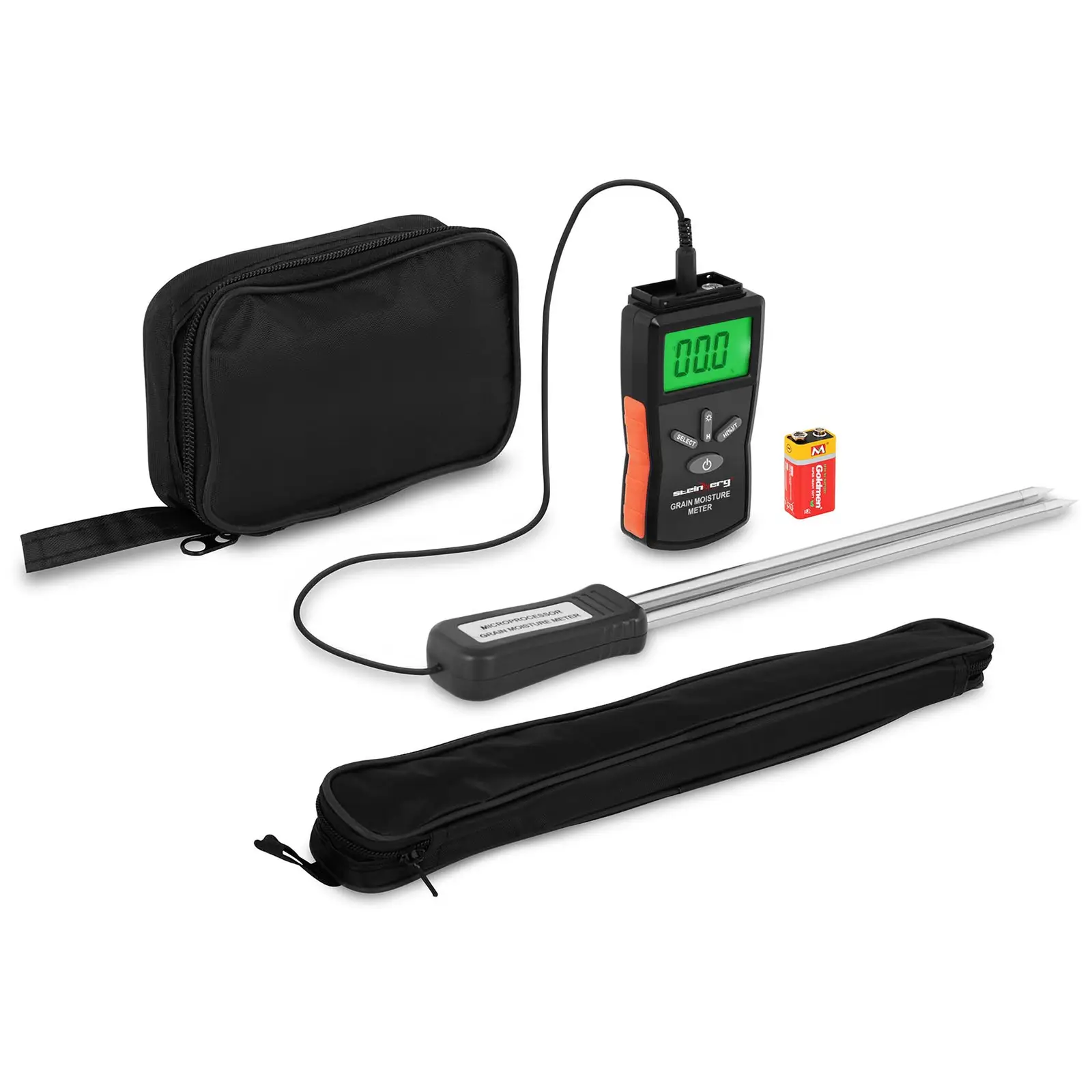 Všechny hodnoty se zobrazují na velkém, snadno čitelném LCD displeji. Pomocí několika málo tlačítek si můžete vybírat mezi jednotlivými funkcemi. Tlačítko Hold podrží výsledek měření, a to i v případě, že čidlo z obilí vyjmete. Čidlo je připojen k měřidlu pomocí dlouhého kabelu, což usnadňuje provádění měření. Samotné zařízení je napájeno 9 V baterií, takže jej můžete používat kdekoli chcete a bez externího zdroje napájení.